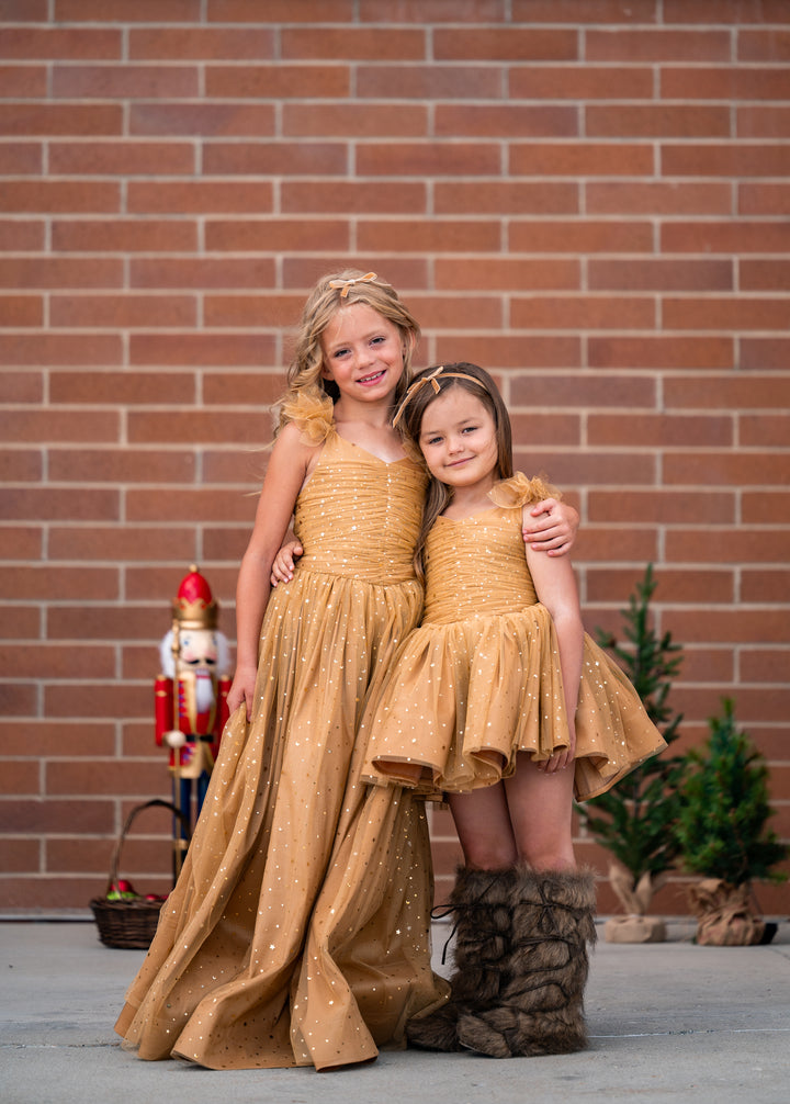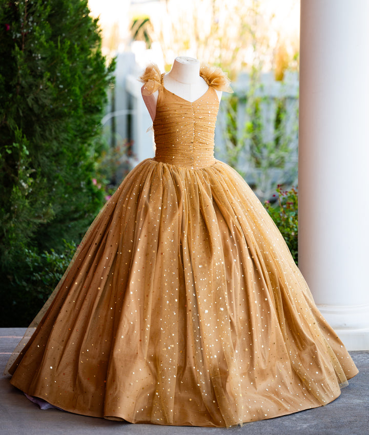 This is a pre-order. Turnaround time is 3-6 weeks. Dresses will be made in the order they were received!Dress details:Soft gold lace with tiny star and moon sequins in gold. A center-ruched bodice with flutter sleeve details, all over gold...