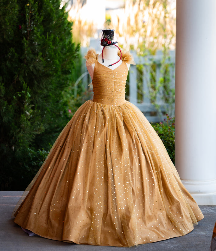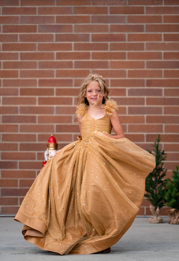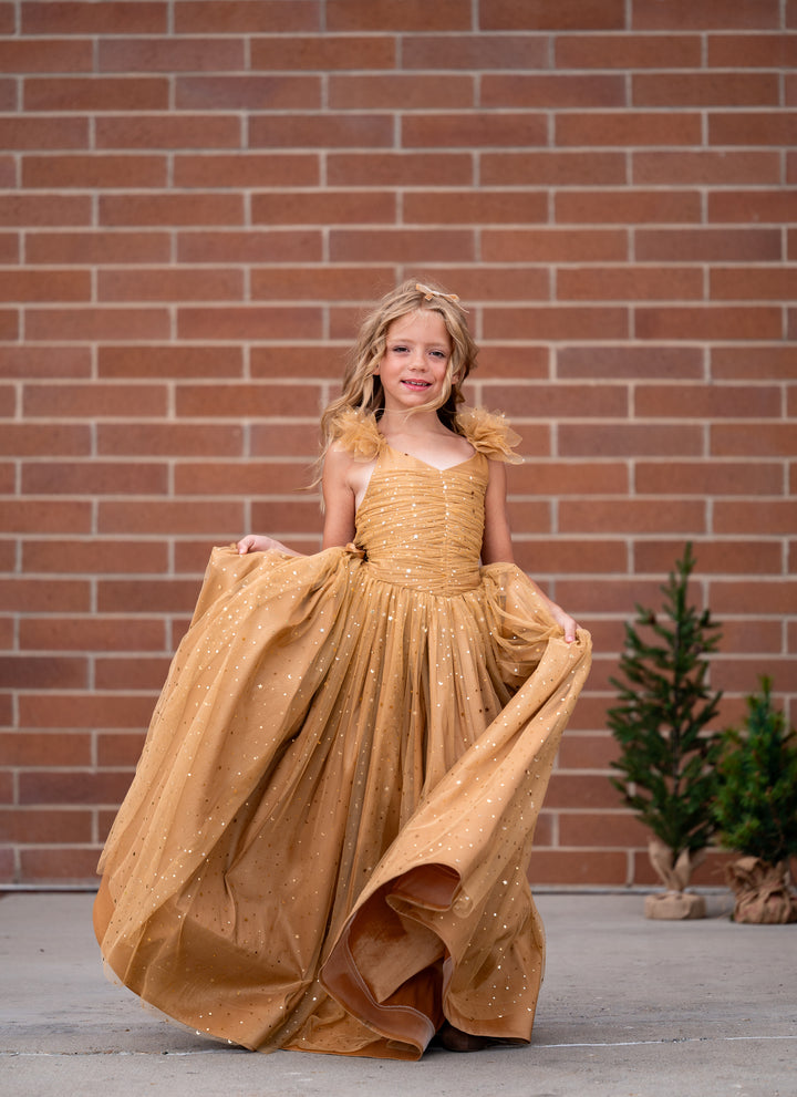 Soft gold lace with tiny star and moon sequins in gold. A center-ruched bodice with flutter sleeve details, all over gold taffeta. This dress is so versatile and would be PERFECT for Holidays (Christmas and New Year's), Winter, plus Summer and Fall. It would also be stunning as a birthday dress.