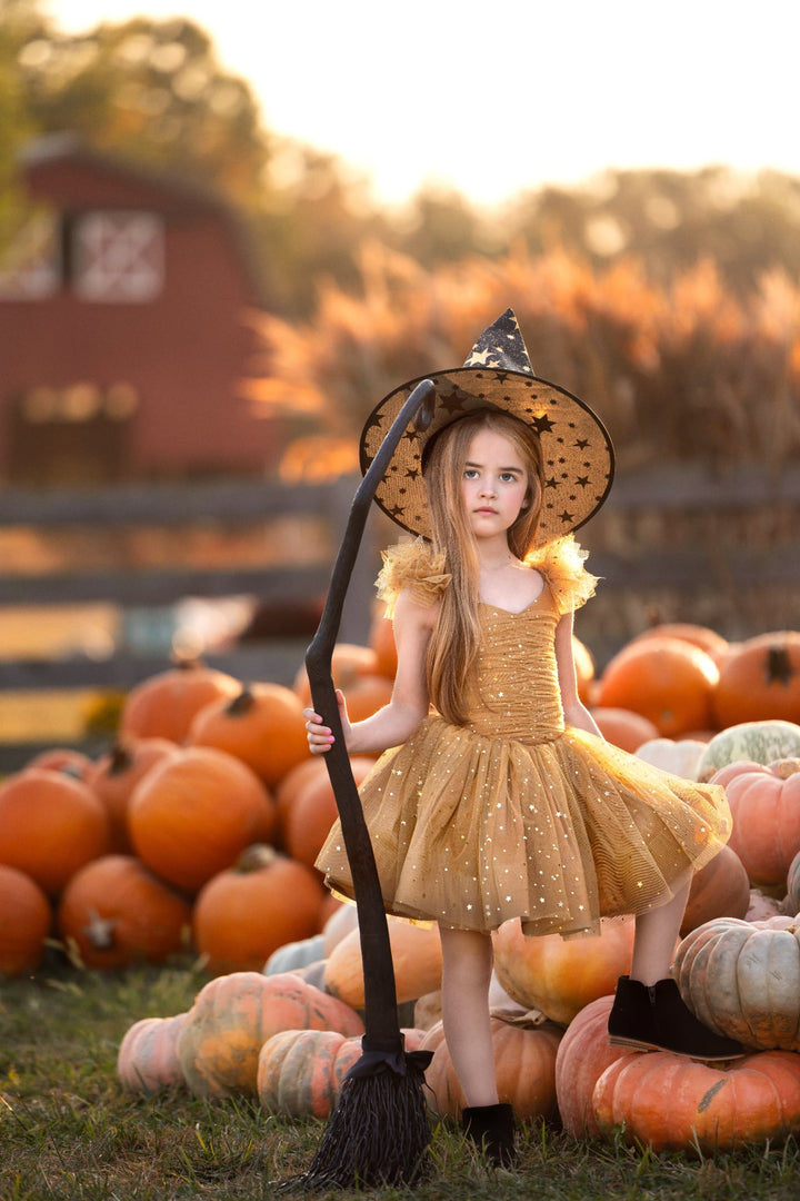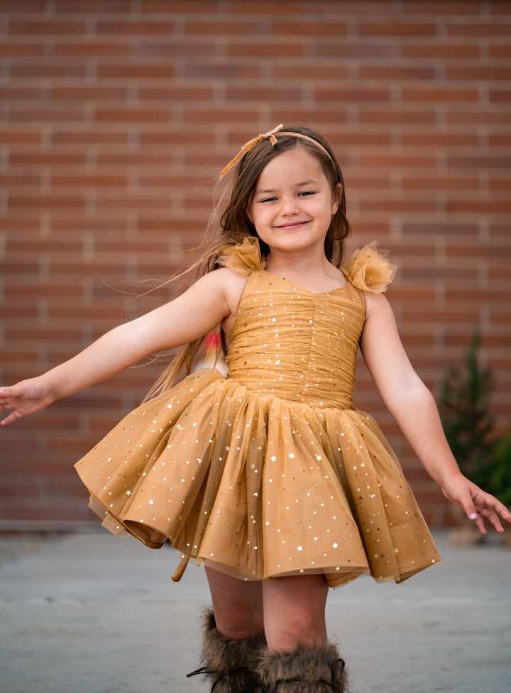 This is a pre-order. Turnaround time is 2 weeks. Photo credit:Cream n' Cocoa PhotographyDress details:Soft gold lace with tiny star and moon sequins in gold. A center-ruched bodice with flutter sleeve details, all over gold taffeta. This dress is so versatile...