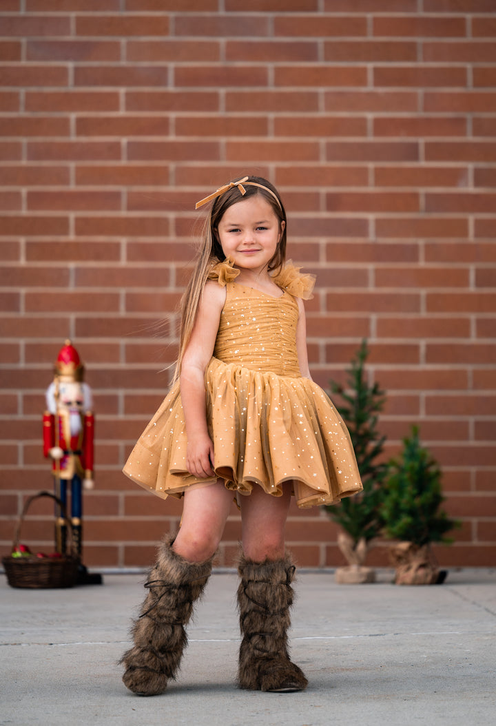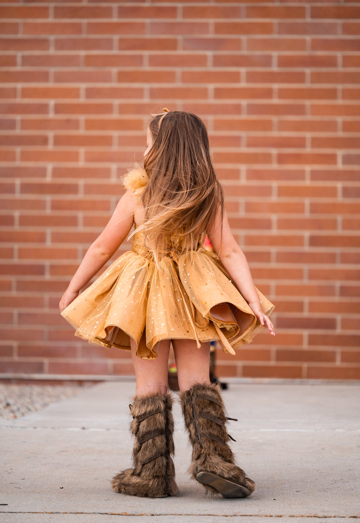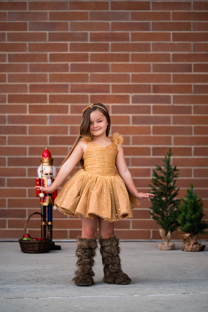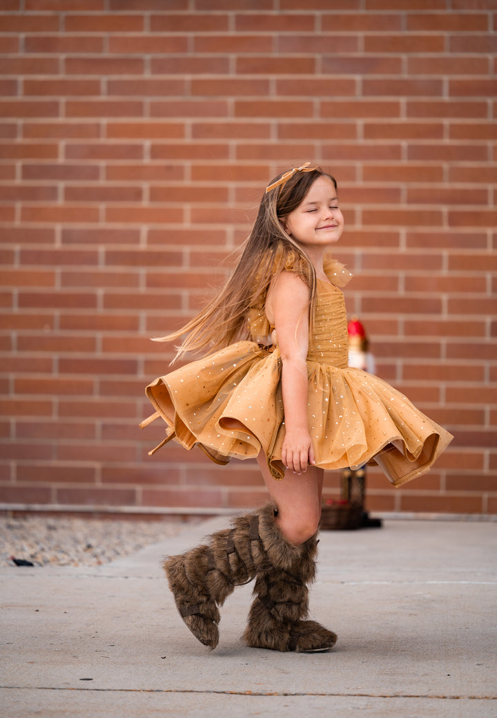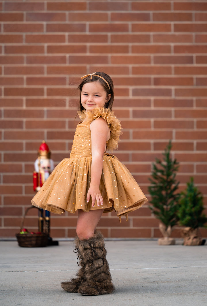 Soft gold lace with tiny star and moon sequins in gold. A center-ruched bodice with flutter sleeve details, all over gold taffeta. This dress is so versatile and would be PERFECT for Holidays (Christmas and New Year's), Winter, plus Summer and Fall. It would also be stunning as a birthday dress.