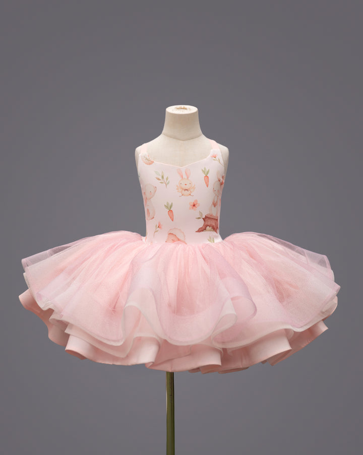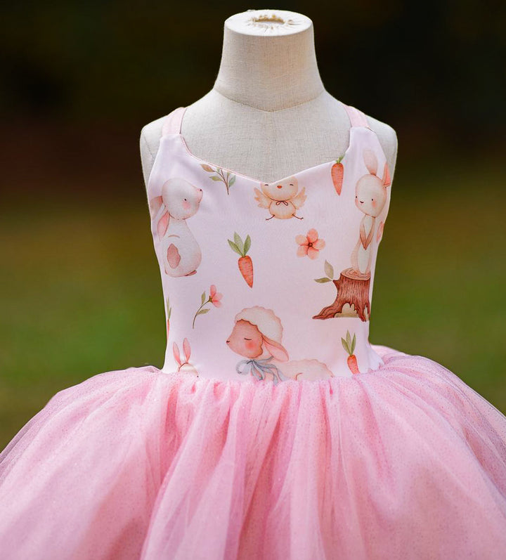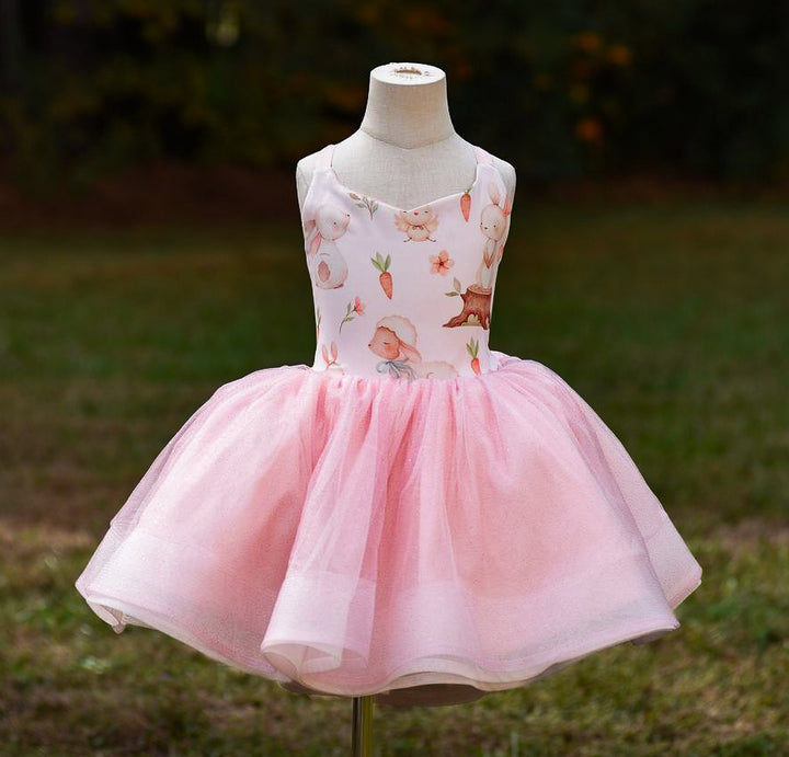 A sweet and whimsical chiffon bodice with little bunnies, lambs, carrots, and flowers, so adorable!! Paired with a 4 LAYER skirt consisting of one layer glitter tulle, 2 layers mesh, 1 layer taffeta; all layers with horsehair hem! Plus underneath that is a sewn in crinoline for effortless poof!