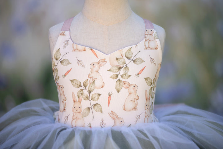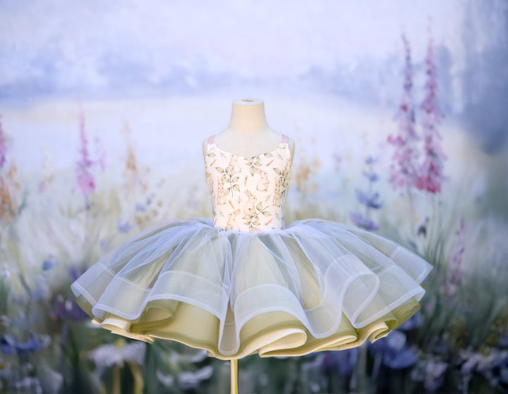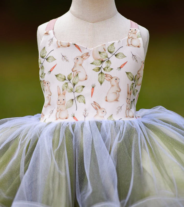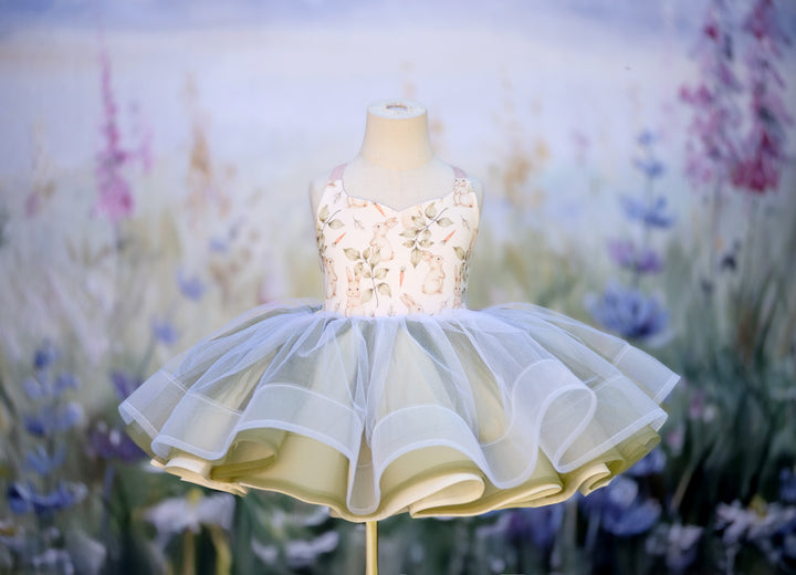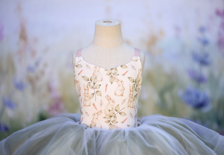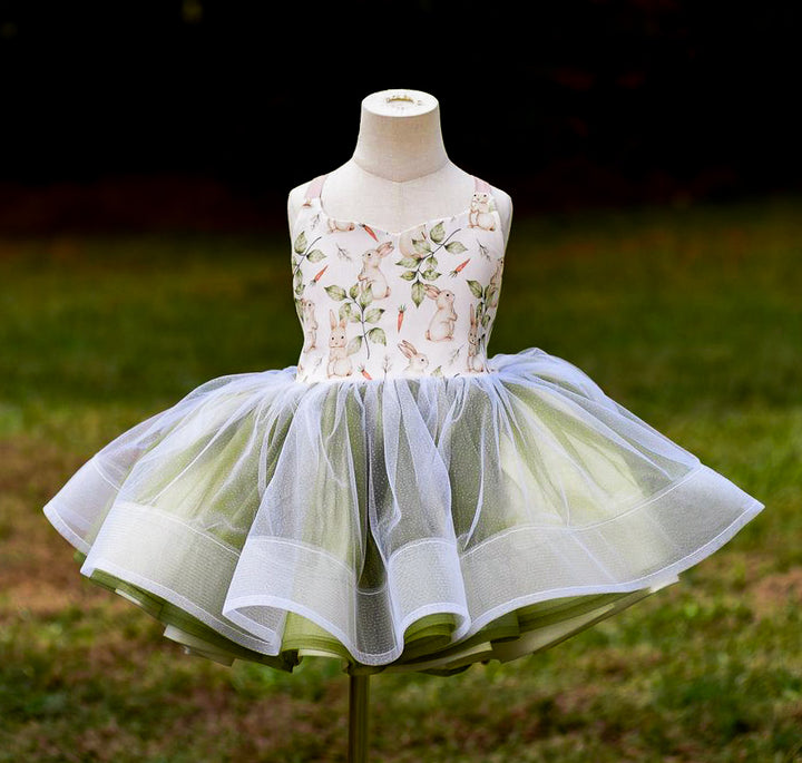 The sweetest bunnies accented in leaves and carrots on a chiffon bodice... Paired with a 4 LAYER skirt with glitter tulle, 2 layers mesh, 1 layer taffeta, all layers with horsehair hem, PLUS crinoline sewn in underneath for effortless poof!