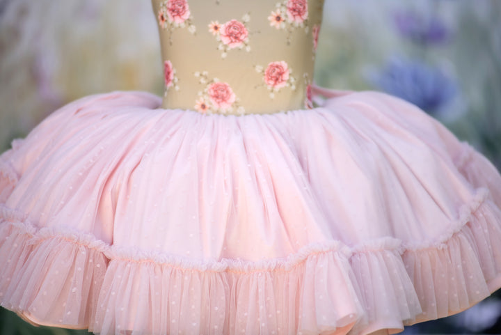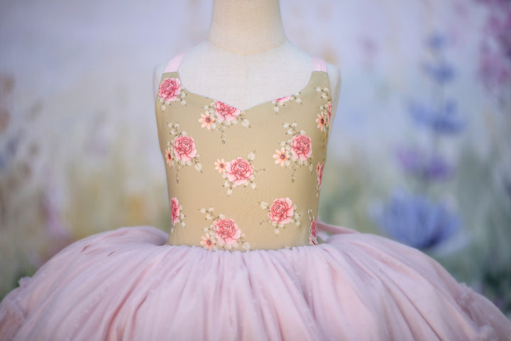 Soft sage green bodice with roses and florals in pastels. Perfect for Spring in general and also for Easter! Paired with a ruffle hem skirt in swiss dot with crinoline underneath for poof! <3