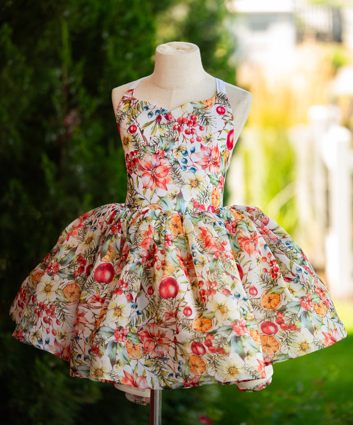 Made with a super soft, beautiful chiffon in a holiday floral print featuring poinsettia, berries, and florals, with a full skirt hemmed with horsehair braid, over taffeta.