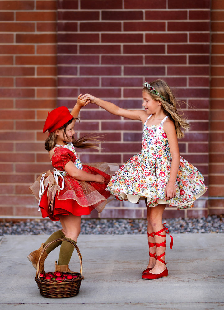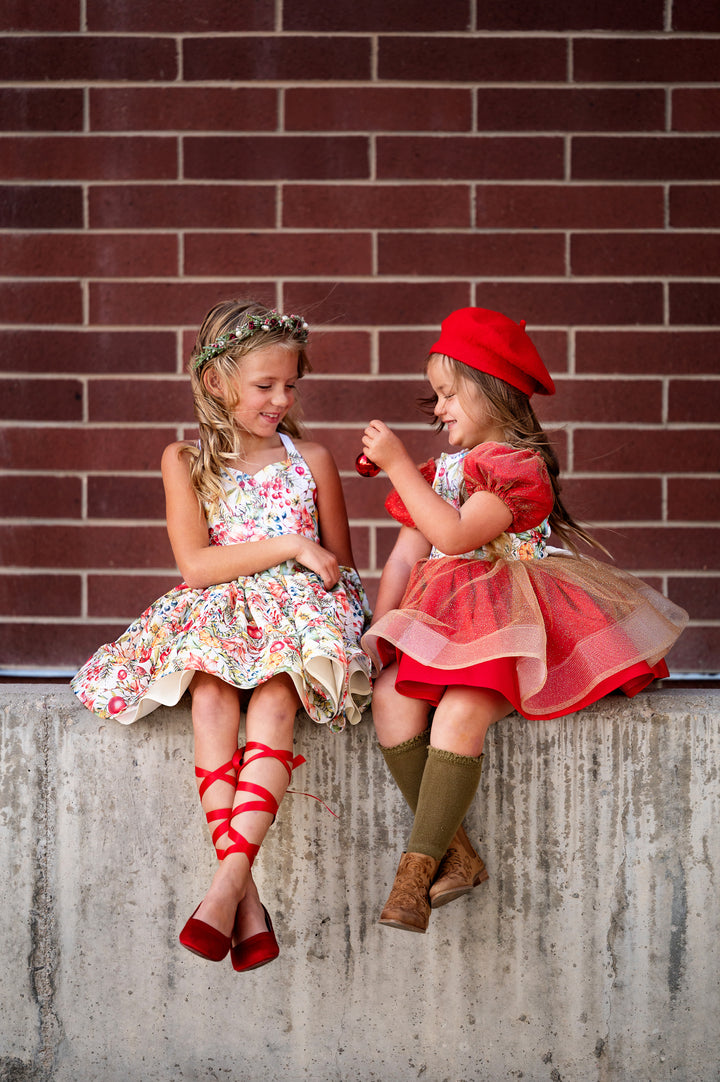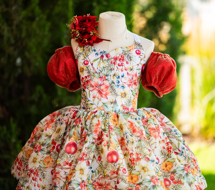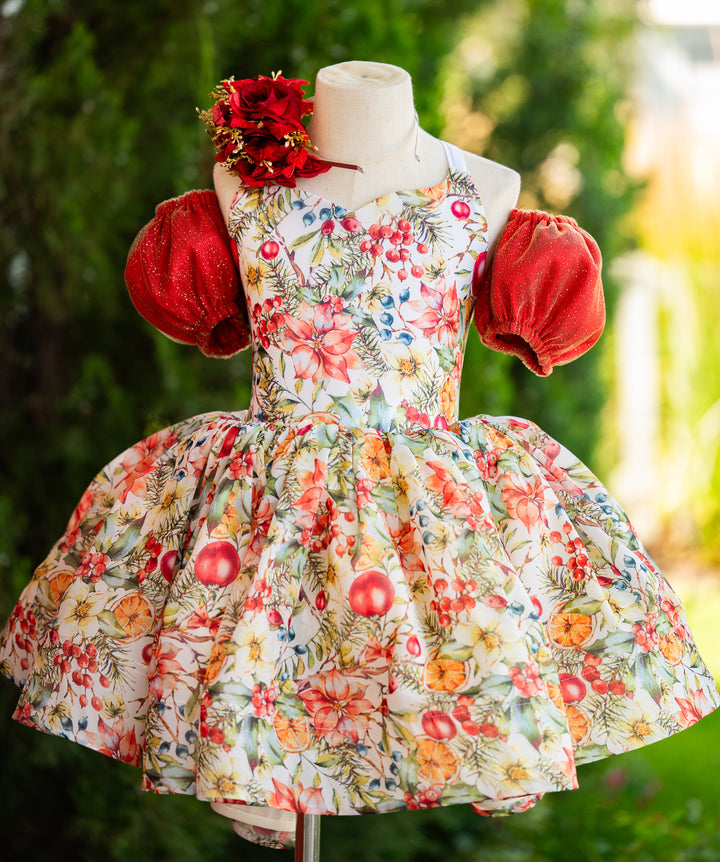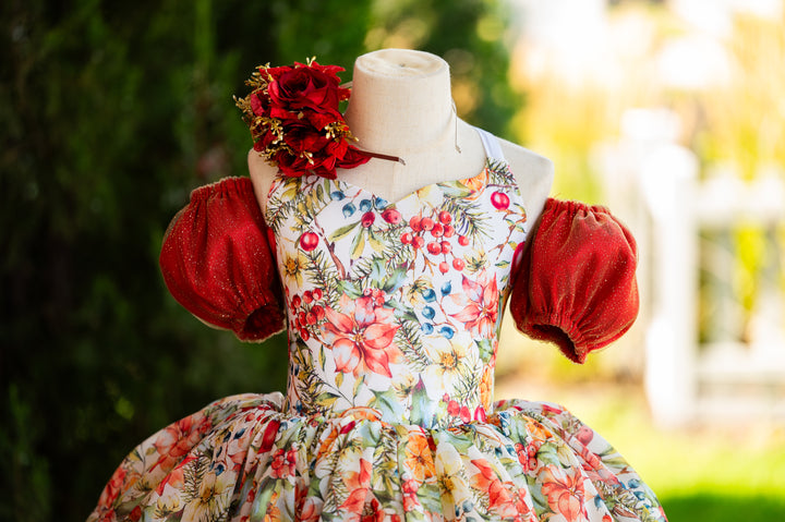The Poinsettia Dress: Size 8, fits 6-10*READY to SHIP*Poof sleeves INCLUDED!! <3 Made with a super soft, beautiful chiffon in a holiday floral print featuring poinsettia, berries, and florals, with a full skirt hemmed with horsehair braid, over taffeta.The back laces...