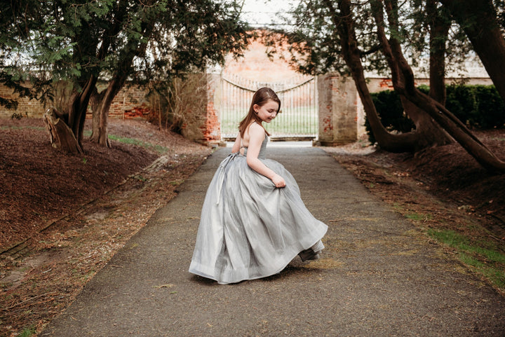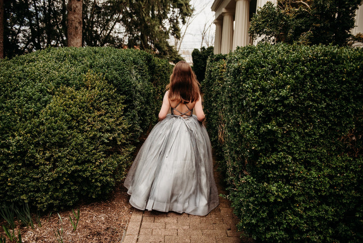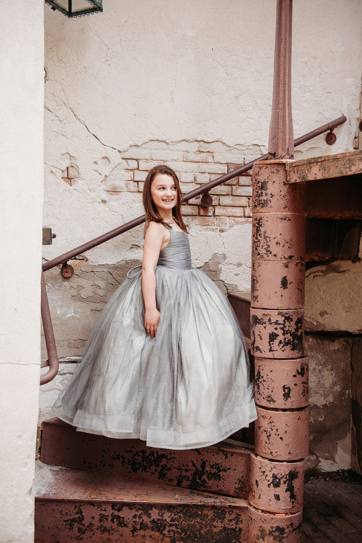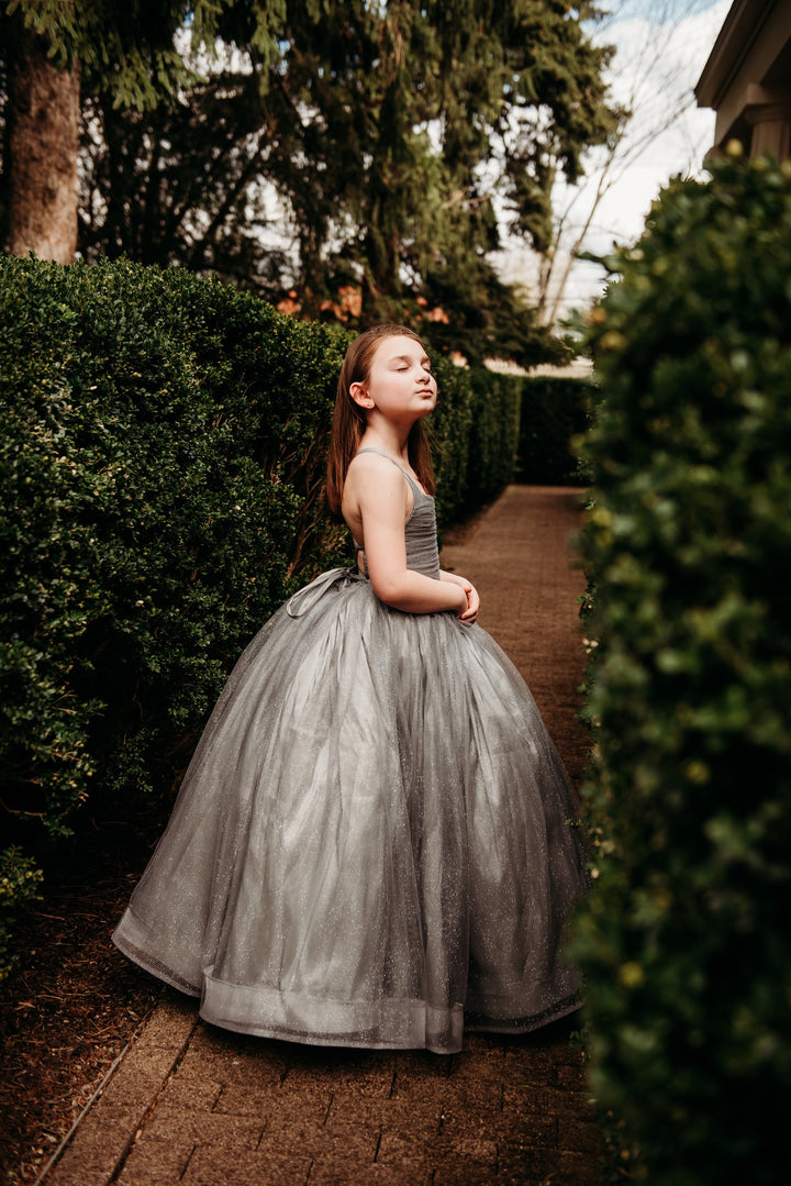 The Silver Glitzy Gown: The Silver Glitzy Gown is made with silver glitter tulle over silver taffeta. It has a center ruched bodice and a lace-up back and stretchy waist. The skirt is a layer of silver glitter tulle over taffeta, both layers with horsehair hem, PLUS a tutu sewn in for maximum poof!!!