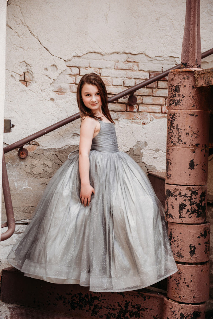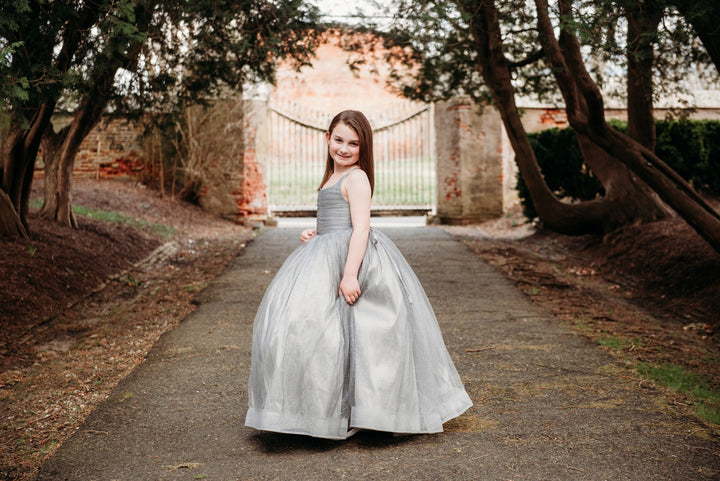 The Silver Glitzy Gown: The Silver Glitzy Gown is made with silver glitter tulle over silver taffeta. It has a center ruched bodice and a lace-up back and stretchy waist. The skirt is a layer of silver glitter tulle over...