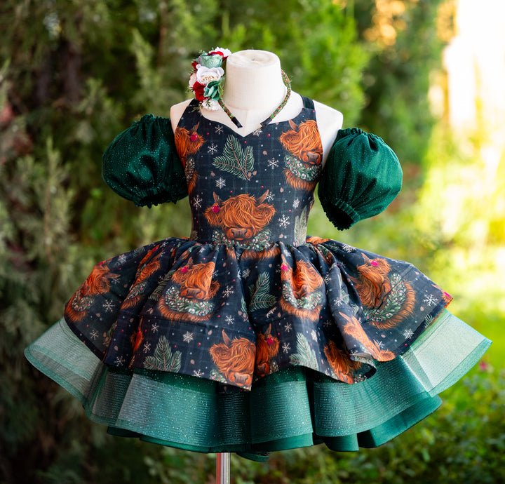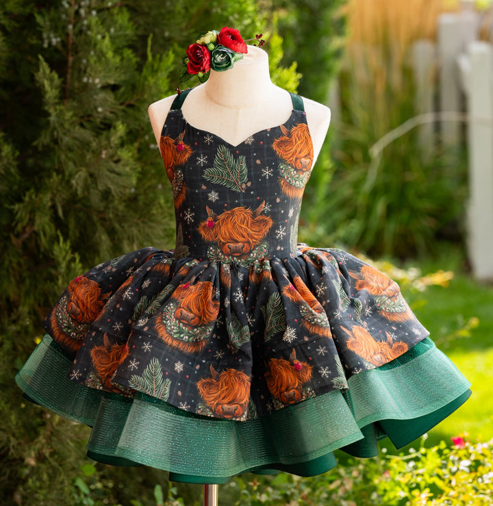 RTS Sale: Size 6, fits 4-8: 'Highland Coos' in Green