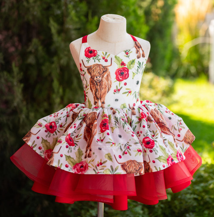 RTS Sale: Size 6, fits 4-8: 'Highland Coos' in Red