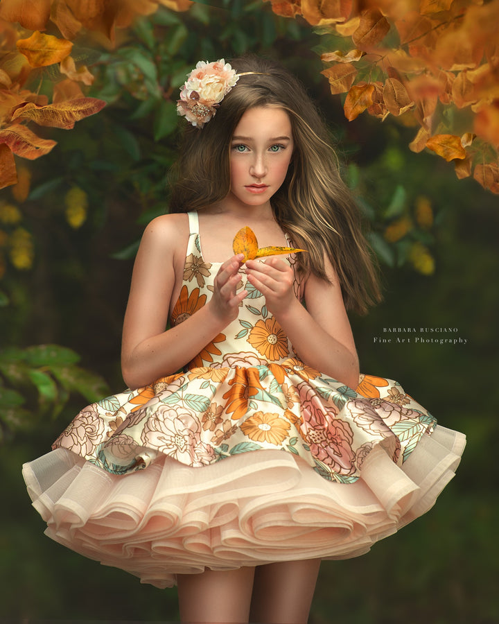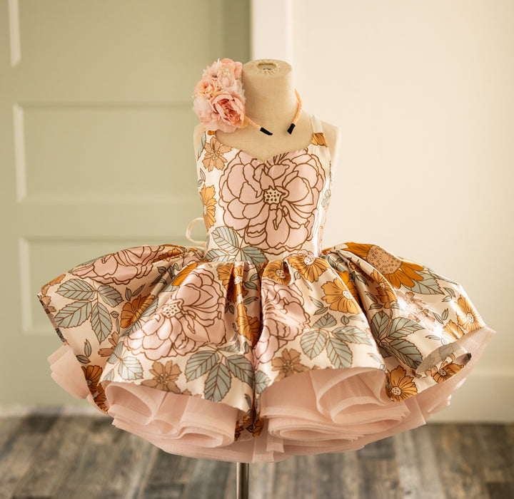 The 'Sunny' gown is a stunning vintage floral print on satin, with max full layers of horsehair trimmed blush mesh underneath. Perfect for Fall family photos and sunflower sessions!