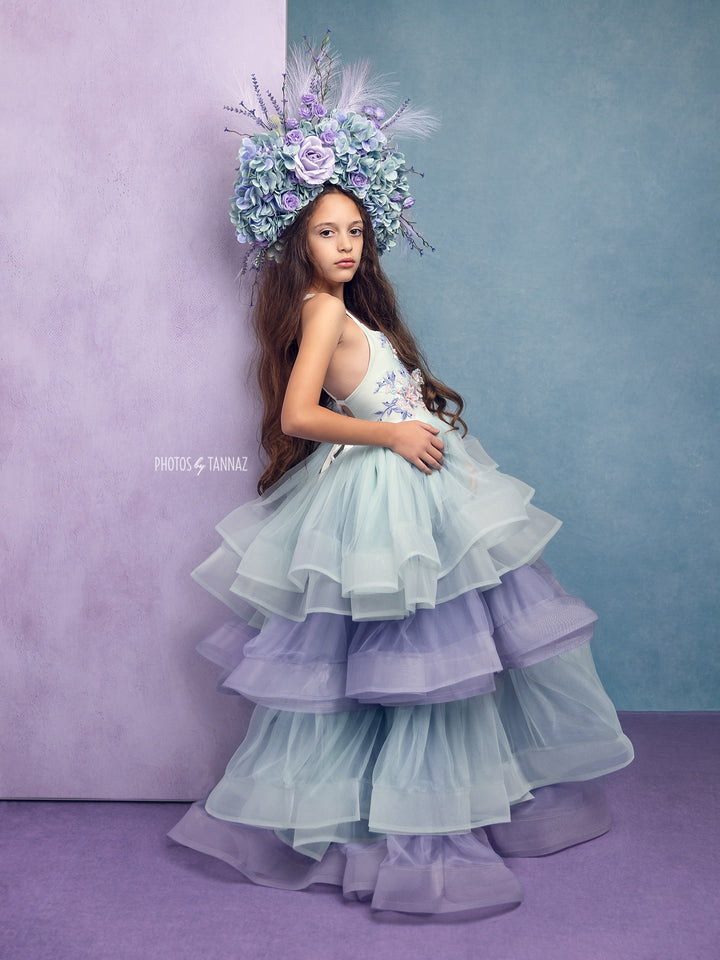 The 'Forget Me Not' Gown: A decadent layered confection in soft aqua blue and periwinkle with an embroidered floral applique on the bodice with light pink accents. The back laces up like a corset and the waist is stretchy, so the sizing is super versatile!