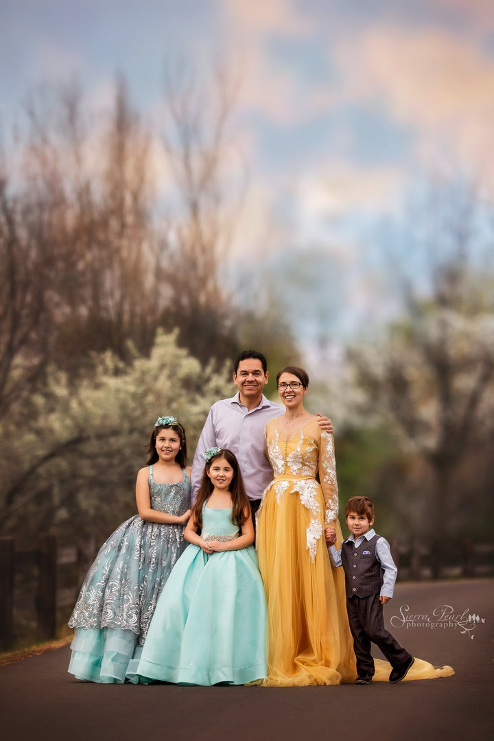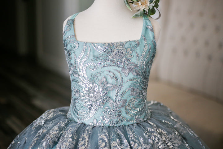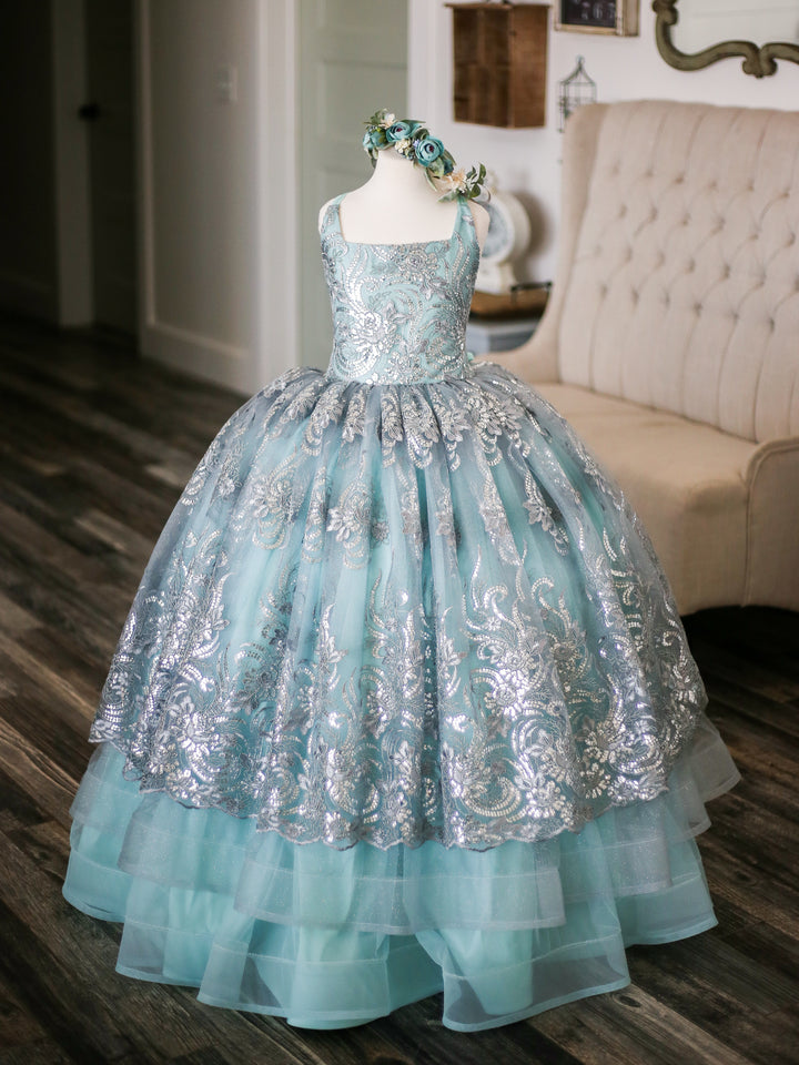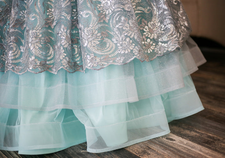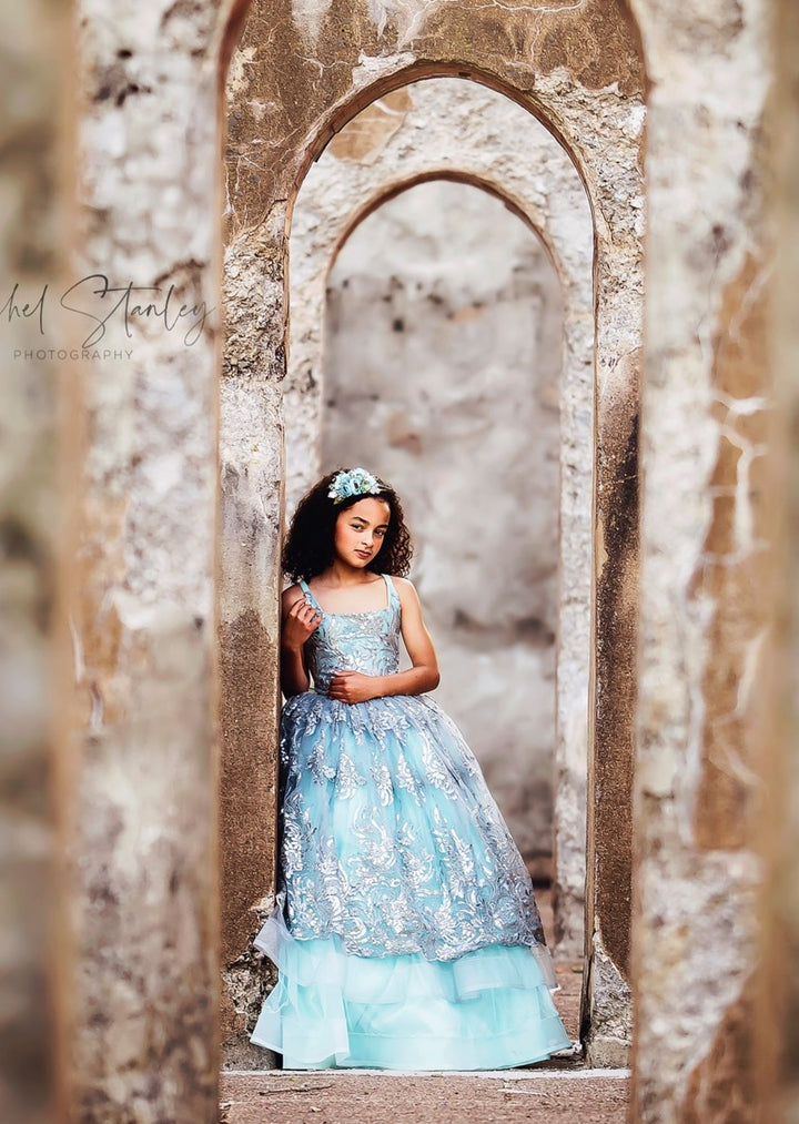The Elsa Gown is a stunning embroidered lace in silver with sequin accents and scalloped edge. Paired with silver glitter tulle over aqua blue, it's perfect for little princesses playing Elsa, Jasmine, or Ariel!! This size 8 will easily fit 6-10 +