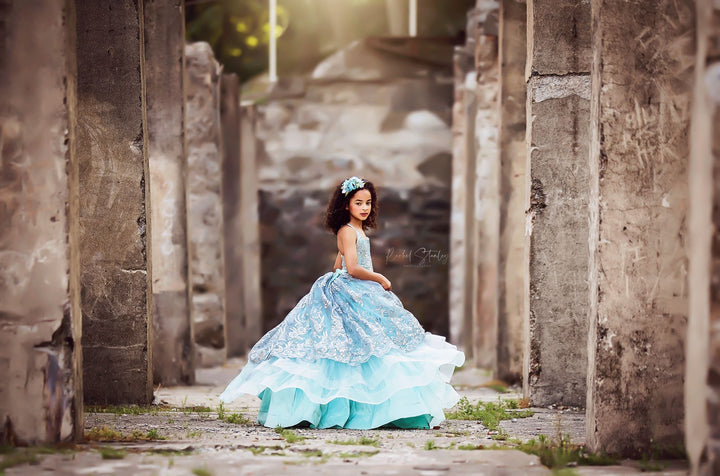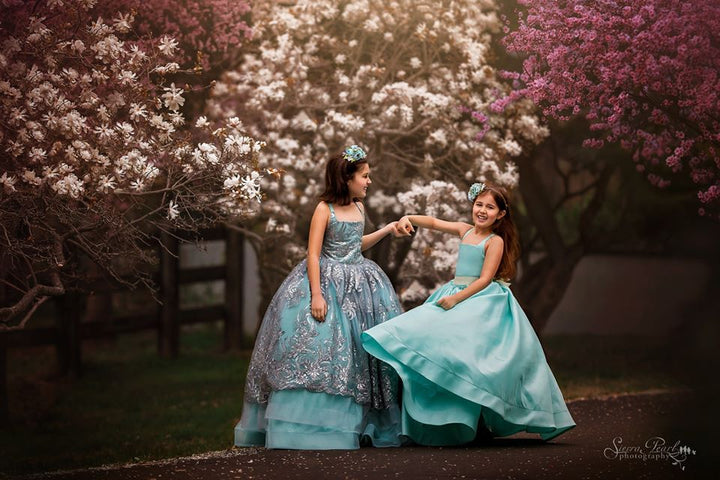 The Elsa Gown is a stunning embroidered lace in silver with sequin accents and scalloped edge. Paired with silver glitter tulle over aqua blue, it's perfect for little princesses playing Elsa, Jasmine, or Ariel!! This size 8 will easily fit...