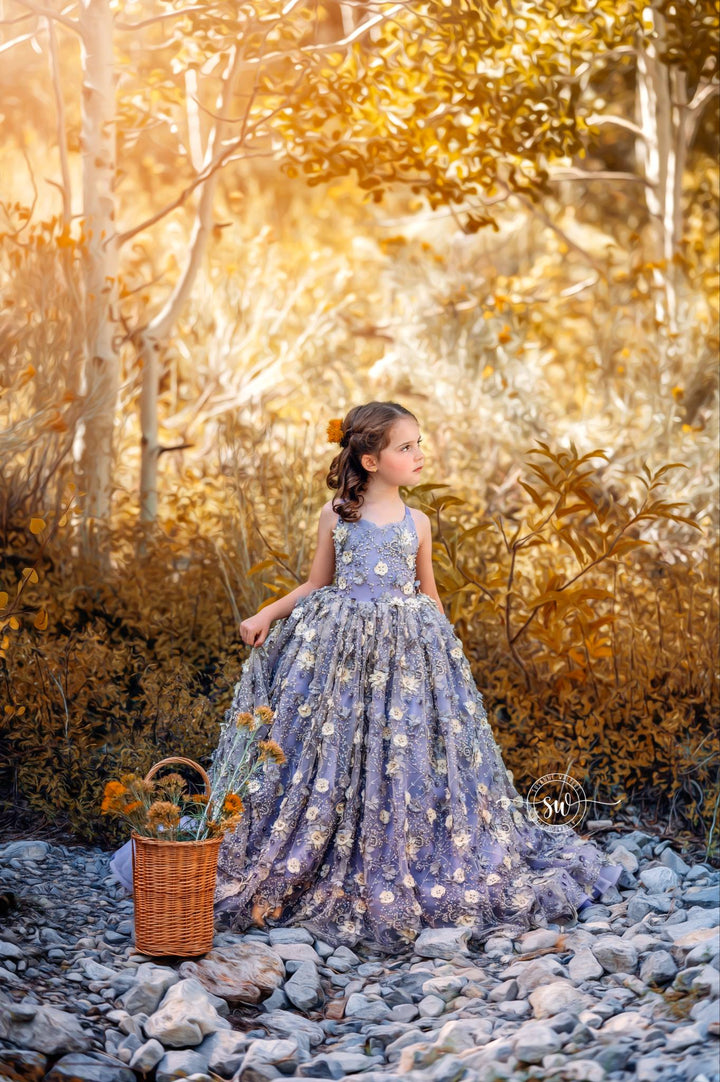 The 'Amethyst' Gown: This lace is to die for!!!! It's embroidered, beaded, accented in pearls, and 3D silk flowers! It's truly stunning!!! The lace features silver embroidery in metallic thread with deep dusty lavender, silver and ivory flowers. I've paired it over a lavender mesh and taffeta. It's an absolute beauty and would be stunning for princess portraits or styled in an elegant family photo shoot.