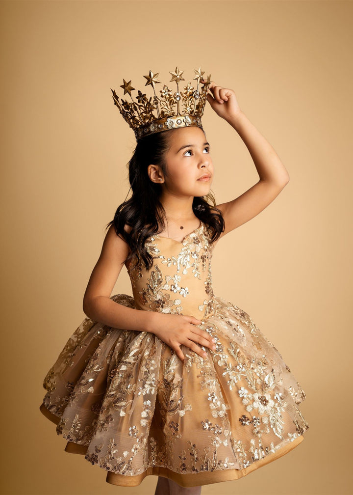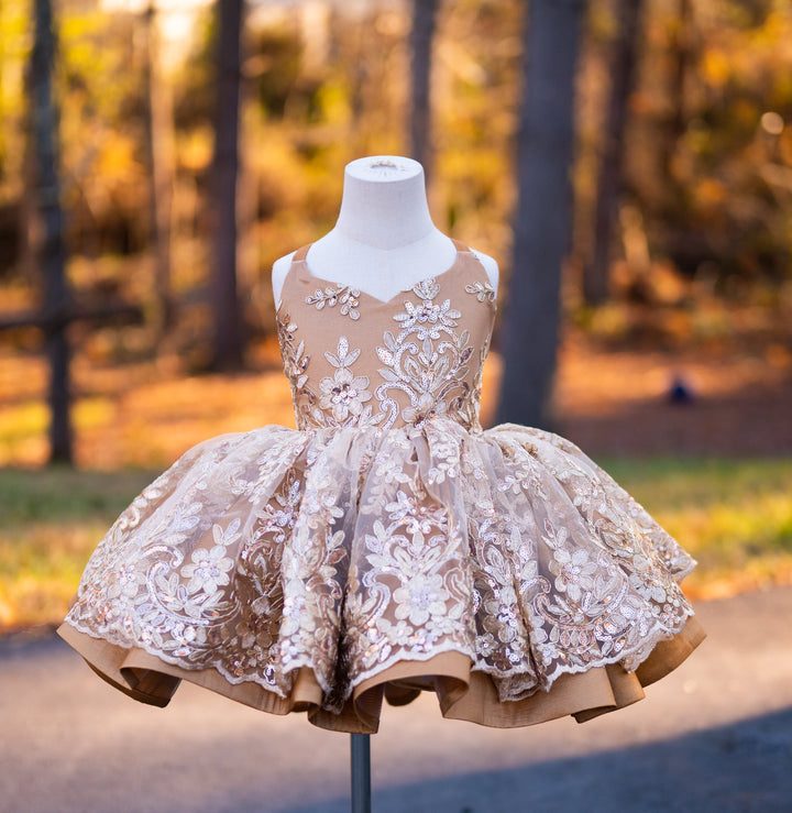 This is our super glamorous "gilded mermaid" lace, that you've seen me put over mint. In this dress, I put it over gold, and it's honestly just absolutely stunning!!!! The skirt has a layer of crinoline underneath, so it holds it's poof and structure. The back laces up like a corset, and the waist is stretchy, so the sizing is SUPER versatile. This size 5 will easily fit down to a size 2T and up to a 7 at least!
