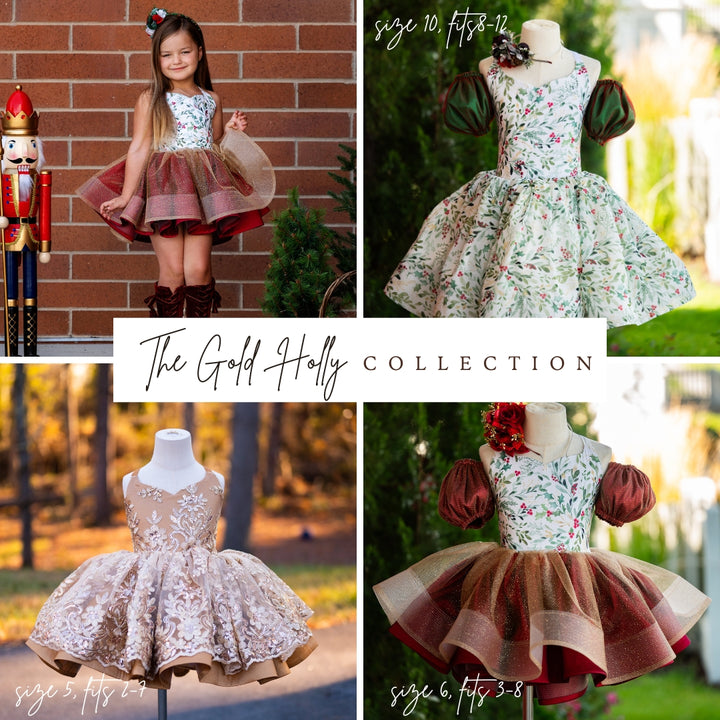 This rental collection includes 3 dresses, with a size range that will fit 2-123 Headbands3 sets of Poof SleevesDress 1:The Mistletoe and Holly Dress: size 10, fits 8-12Super soft chiffon makes up the bodice and the skirt, with a layer...