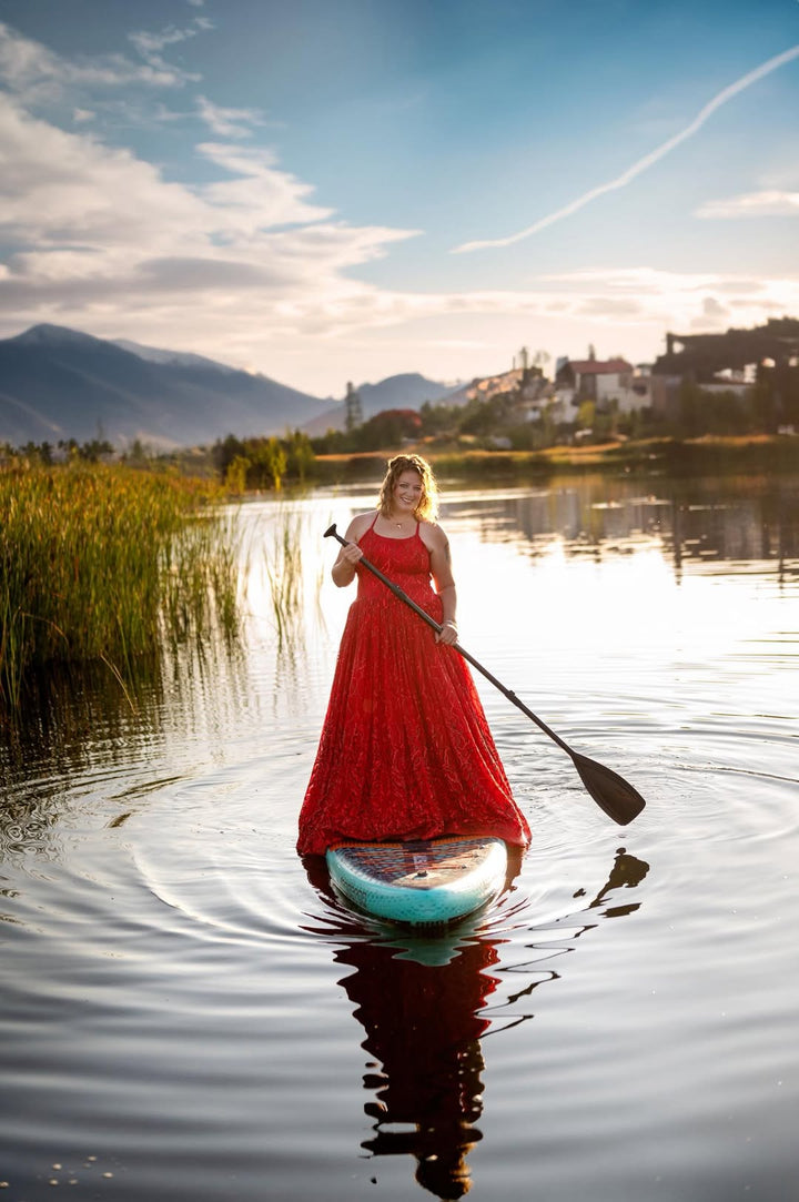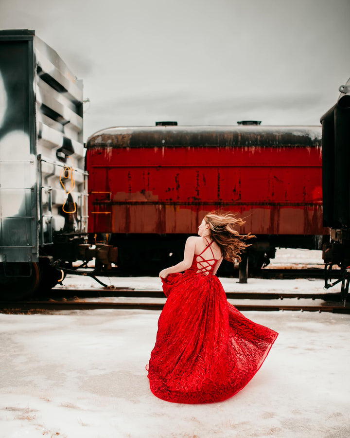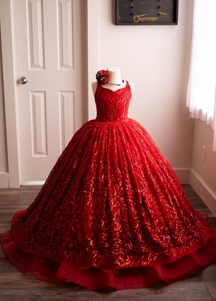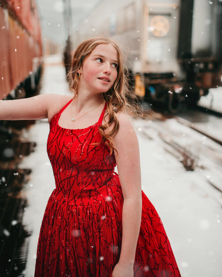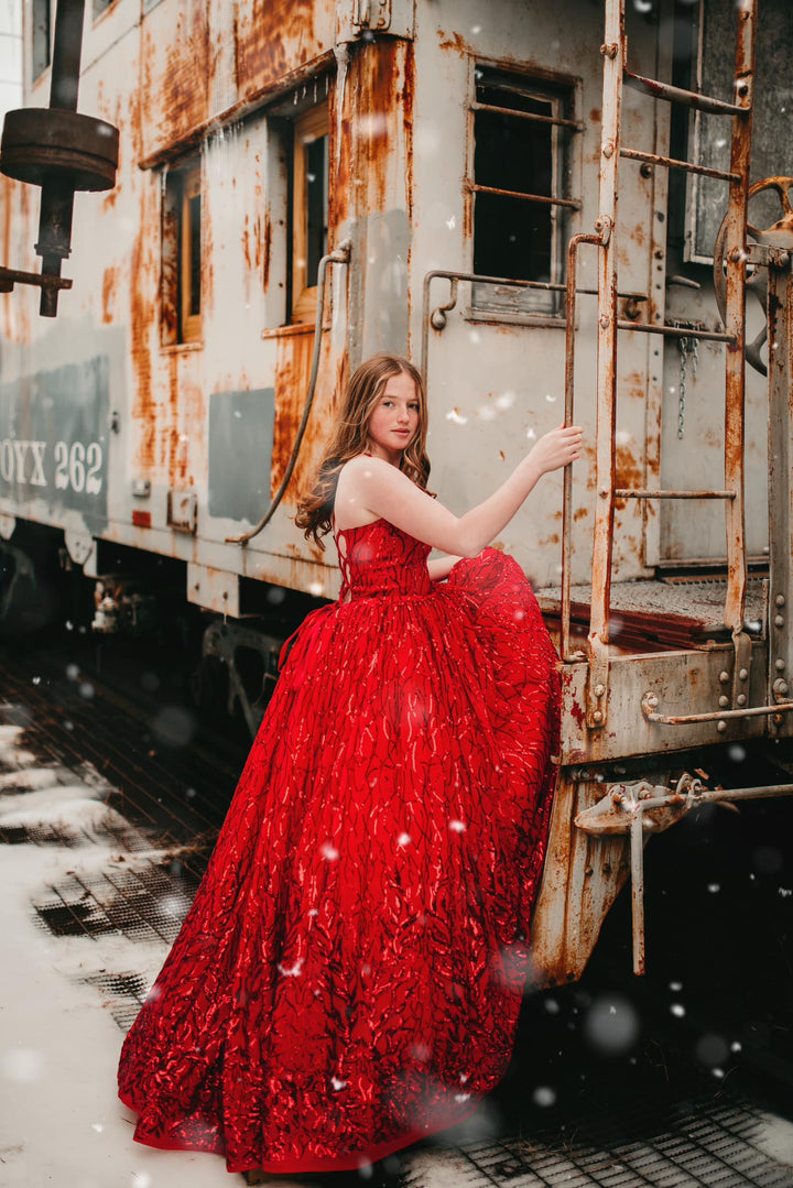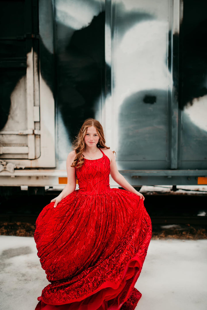 The Jasmine Gown is THE most gorgeous red lace embroidered in a trailing twirly vine pattern of sequins. It's a true vibrant red shade. With tons of layers of soft mesh in the skirt, and a lace-up back and stretchy waist making sizing SUPER versatile, you can't go wrong with this gown whether it's an individual teen session or a family session! You could put this dress on big sister or mom!!