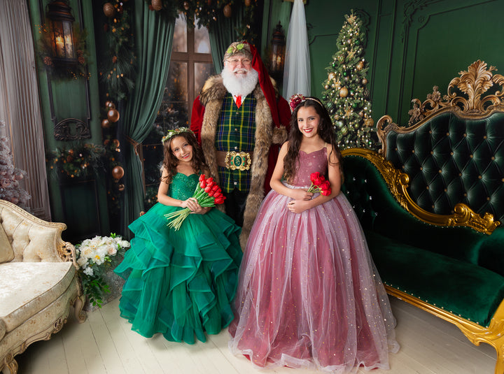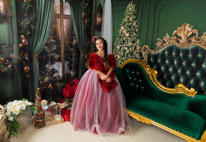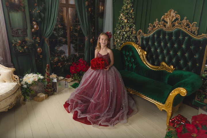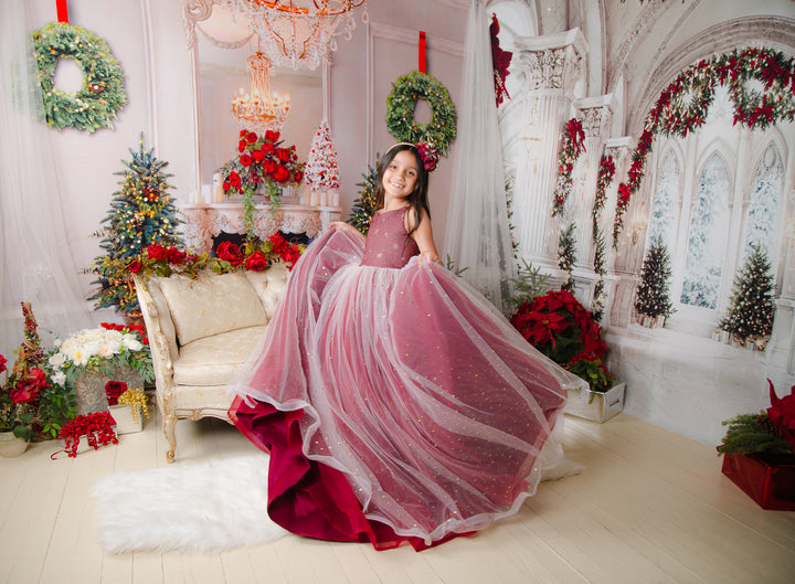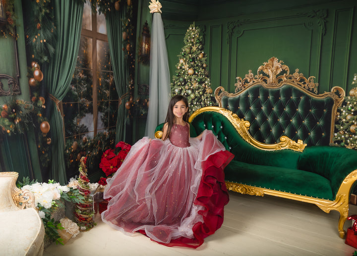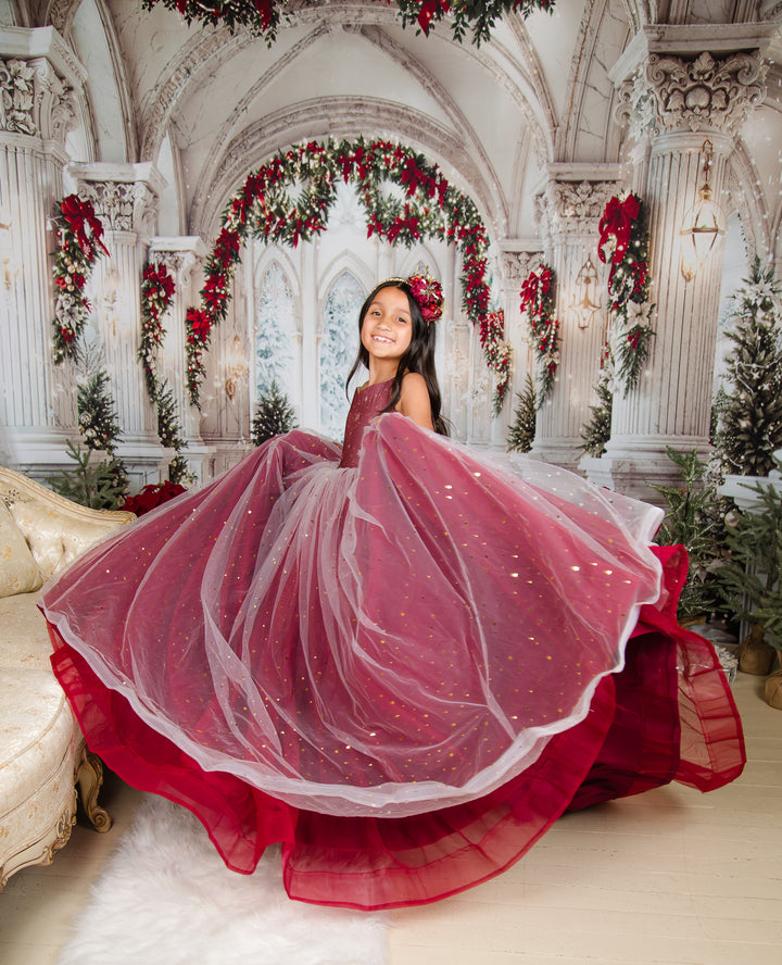 The Scarlet Gown is a gorgeous snowflake print chiffon bodice, with the skirt in a glittery sequin star overlay over deep dark red (almost a burgundy color), with horsehair braid in each layer of skirt, adding lots of movement and texture. A tutu is sewn in, AND a hoop skirt is included, so you can adjust the level of poof as desired. The bodice has our famous lace-up back and stretchy waist, which makes the sizing SUPER versatile! This size 8 dress will fits sizes 6, 7, 8, 9, 10 +