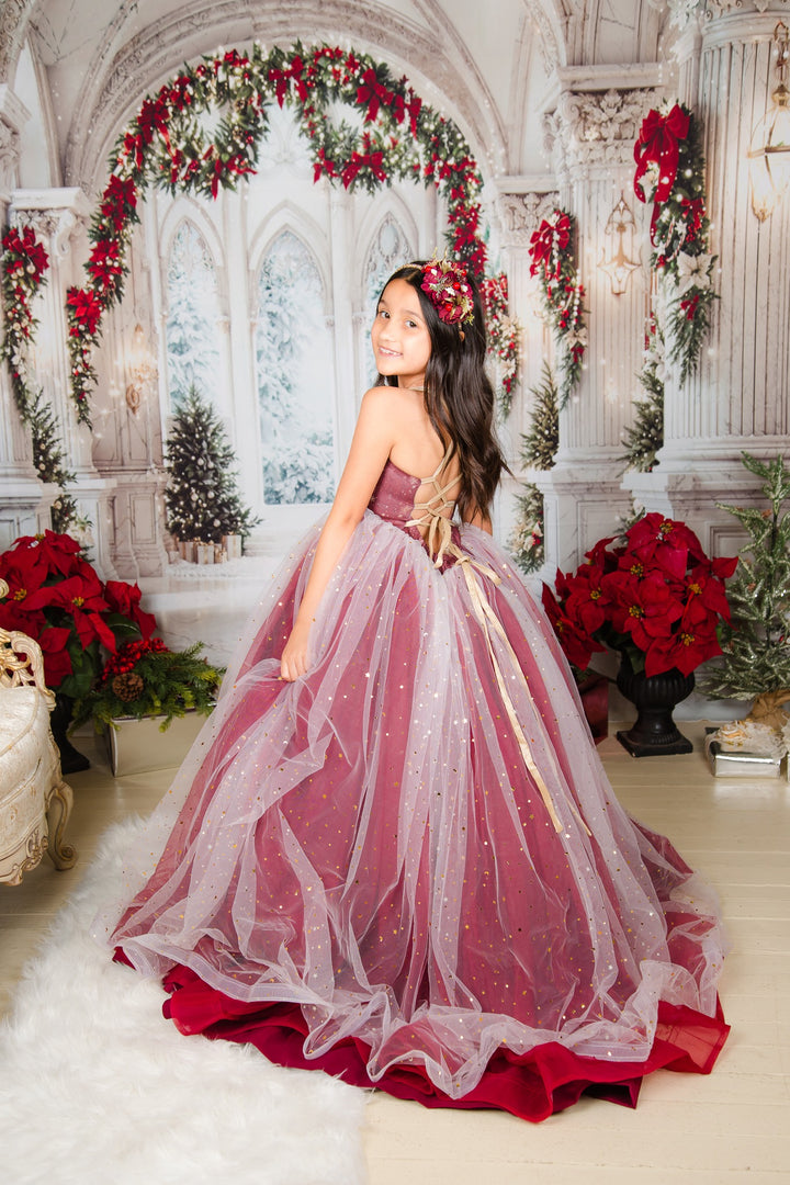 The Scarlet Gown is a gorgeous snowflake print chiffon bodice, with the skirt in a glittery sequin star overlay over deep dark red (almost a burgundy color), with horsehair braid in each layer of skirt, adding lots of movement and...